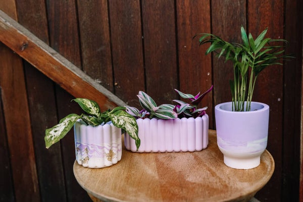 Terrazzo, marmer, bladgoud,.... maak je eigen uniek ontwerp! Je kan kiezen tussen verschillende vormen van bloempotjes.